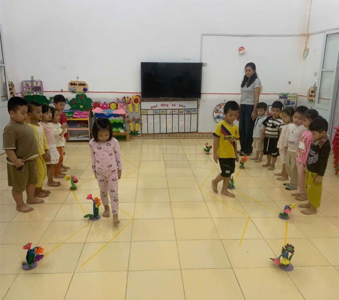 Hoạt động kết hợp với trò chơi vận động vui nhộn, giúp trẻ hứng thú, phát triển sự nhanh nhẹn, phối hợp tay – chân và khả năng định hướng trong không gian. Cuối giờ, cô cùng trẻ nhận xét và củng cố kỹ năng đã học.