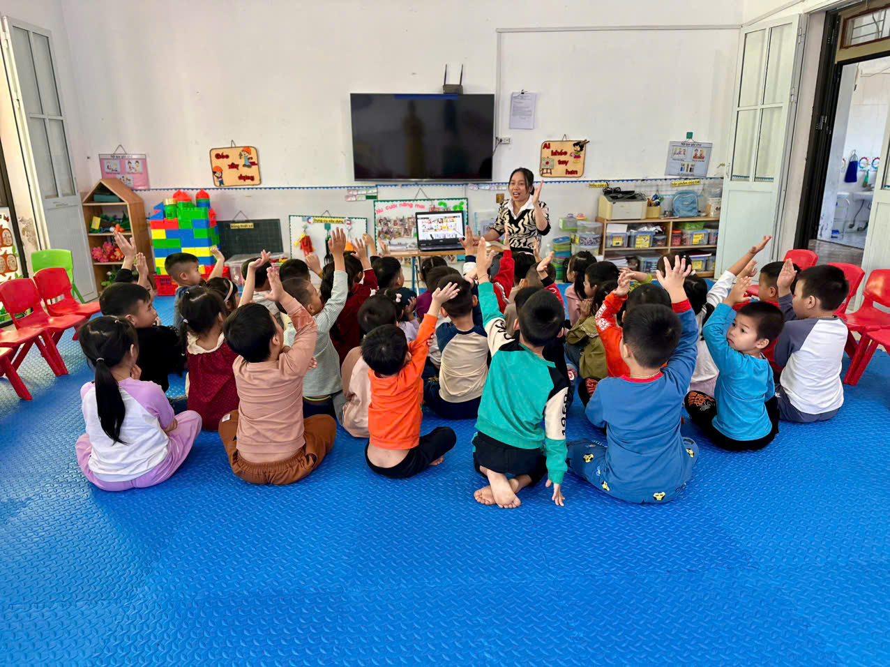 Các bé hứng thú giơ tay phát biểu, mạnh dạn chia sẻ những gì mình biết về công việc hằng ngày của mẹ. Trẻ tự tin nêu ý kiến, đặt câu hỏi và lắng nghe bạn bè, thể hiện sự chủ động trong quá trình tìm hiểu. Không khí lớp học trở nên sôi nổi và đầy sự gắn kết.