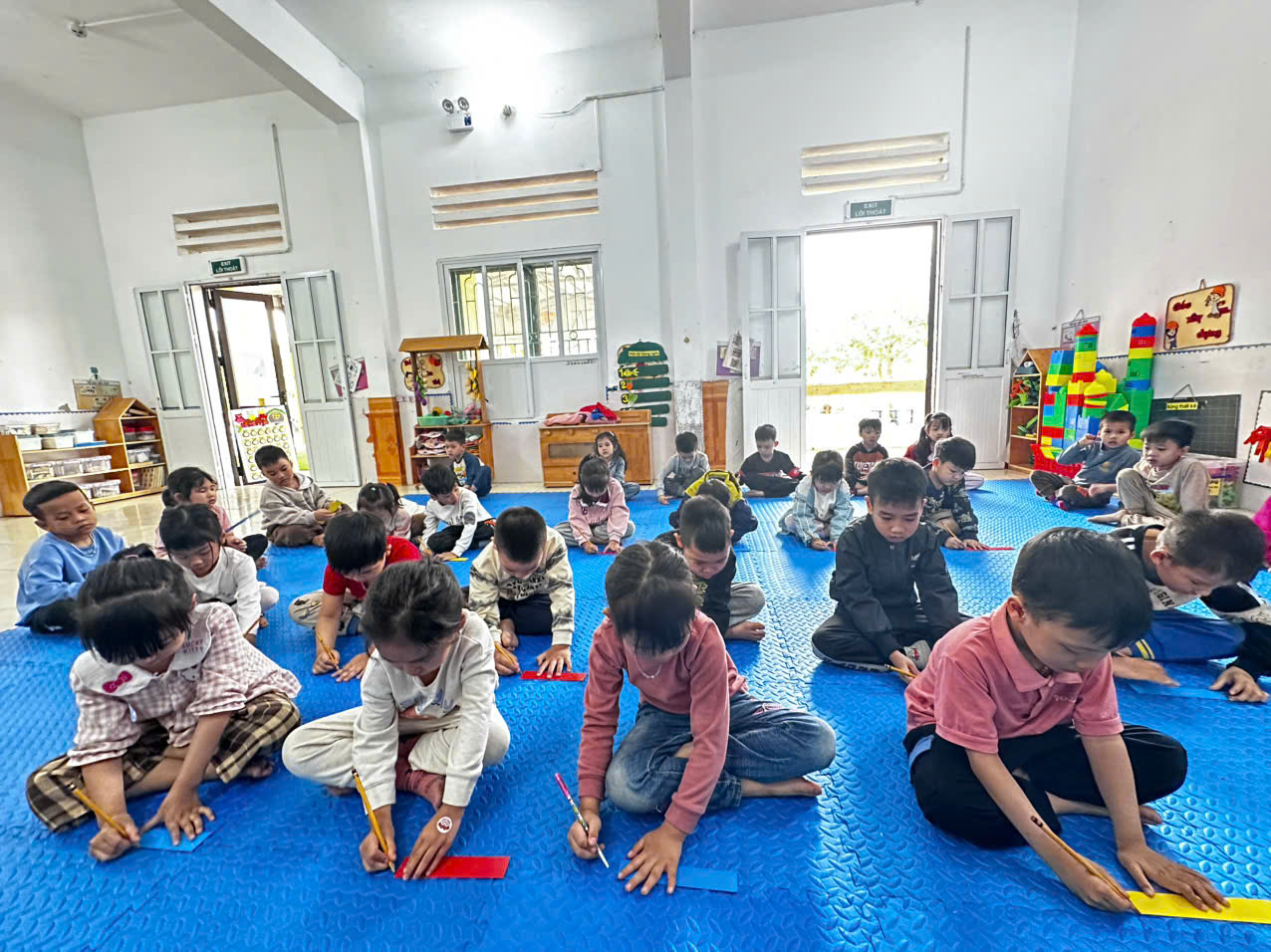 Trong không khí vui tươi, các bé cùng nhau thực hành đo độ dài của tthảm trải nền và đồ dùng trong lớp. Trẻ biết lựa chọn đơn vị đo phù hợp và thực hiện đo theo hướng dẫn của cô giáo. Qua đó, các con thêm tự tin và yêu thích hoạt động khám phá toán học.