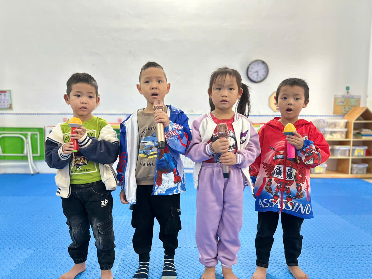 Các bé hăng say cất tiếng hát, giọng hát trong trẻo vang lên đầy cảm xúc khi hát về người bố thân yêu. Trẻ tự tin thể hiện động tác minh họa, ánh mắt và nụ cười rạng rỡ thể hiện niềm vui, sự tự hào. Không khí lớp học trở nên ấm áp, tràn đầy yêu thương qua từng giai điệu của bài hát “Bố là tất cả”.