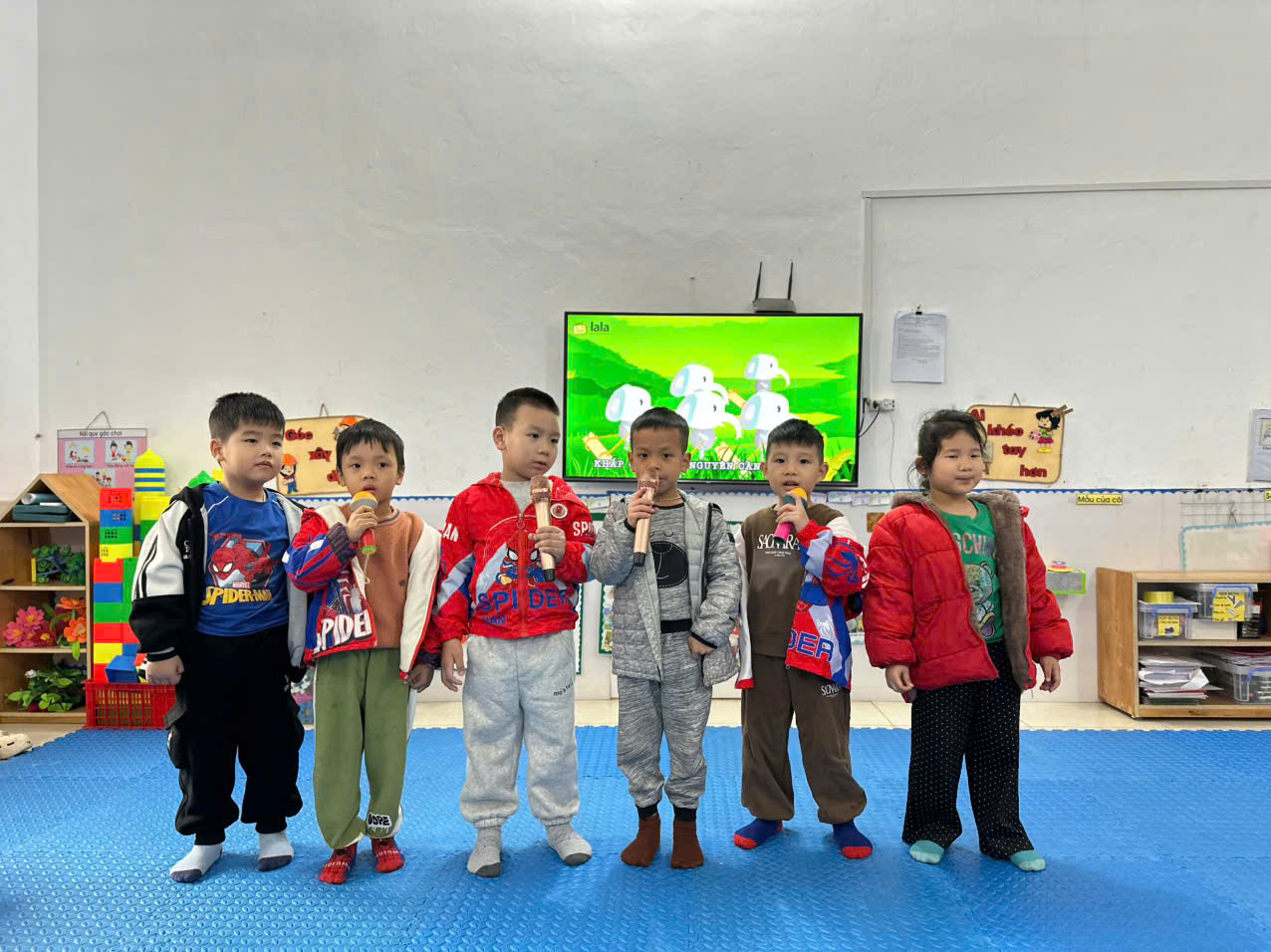 Các nhóm trẻ lần lượt lên thể hiện bài hát theo nhạc với tinh thần vui tươi, hào hứng. Trẻ hát đúng giai điệu, kết hợp vận động minh họa nhịp nhàng và tự tin trước tập thể. Không khí hoạt động diễn ra sôi nổi, tạo niềm vui và hứng thú cho các bé khi tham gia.