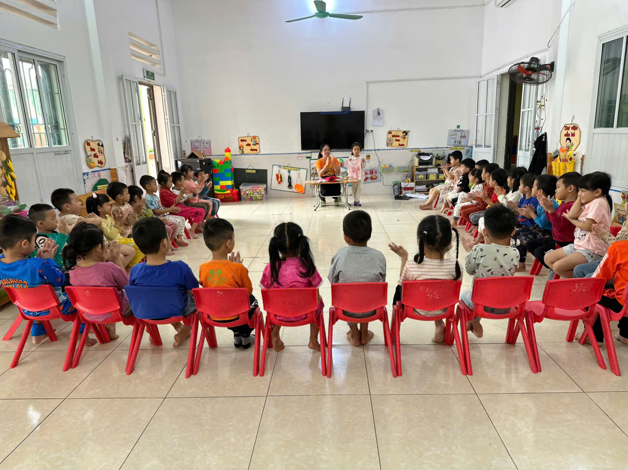 Các bé hào hứng thực hành phơi quần áo, cẩn thận treo lên móc. Khuôn mặt bé nào cũng rạng rỡ, vui thích khi tự tay hoàn thành công việc của mình.