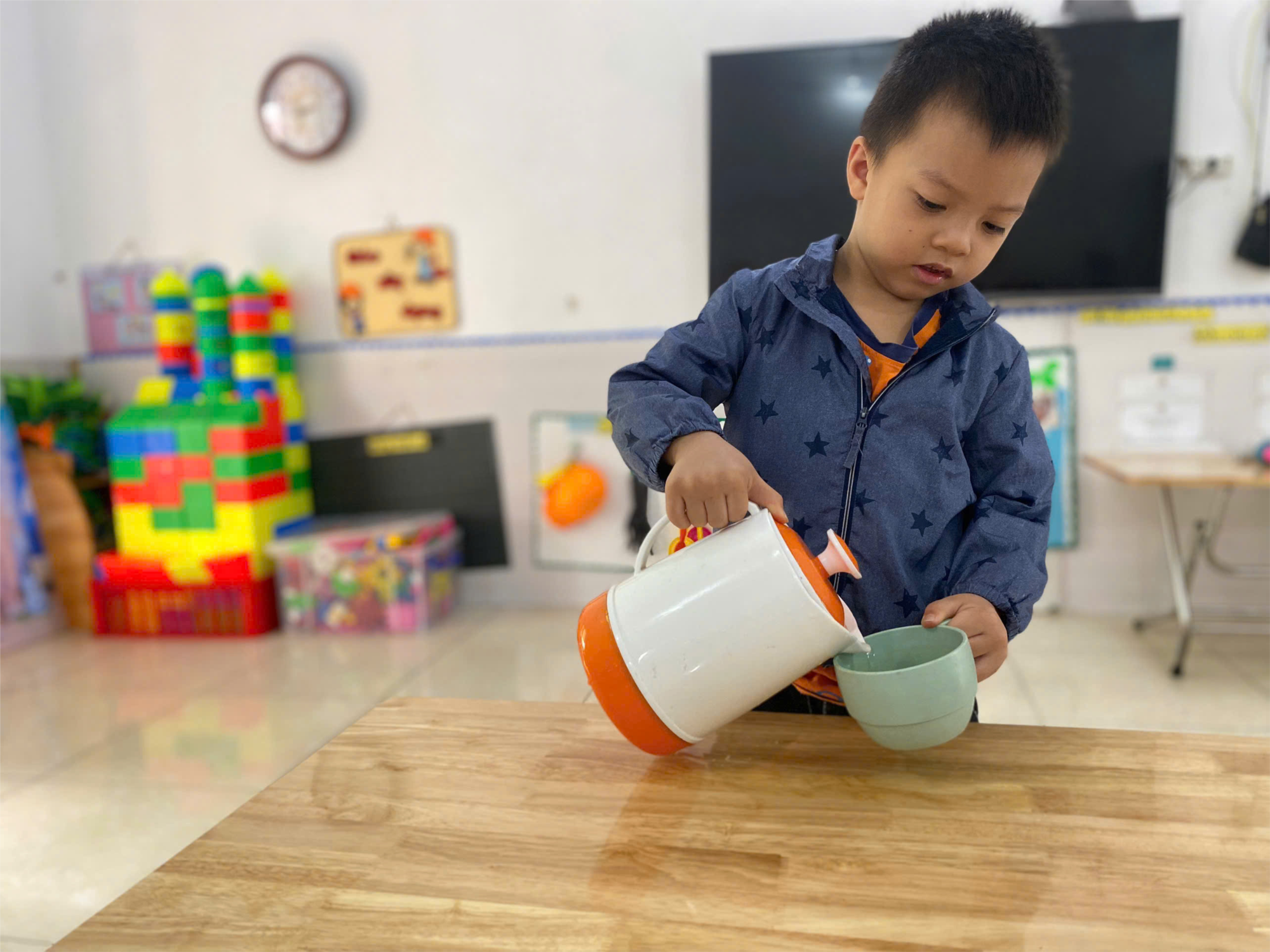 Các bé hào hứng thực hành kỹ năng rót nước dưới sự hướng dẫn của cô giáo. Từng bé cẩn thận cầm bình, nghiêng nhẹ tay để rót nước vào cốc sao cho không bị tràn ra ngoài. Sau khi rót xong, các con vui vẻ mời cô và mời bạn, thể hiện sự tự tin và lễ phép.
