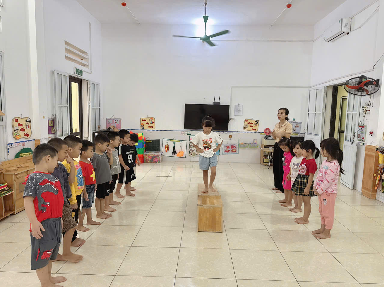 Trong hoạt động, các bé hào hứng tham gia vận động “Đi trên ván dốc”, từng bước giữ thăng bằng và khéo léo di chuyển theo hiệu lệnh của cô. Trẻ rèn luyện được sự tập trung, khả năng phối hợp cơ thể và sự tự tin khi vượt qua thử thách. Hoạt động mang đến cho các bé niềm vui và giúp phát triển thể chất toàn diện.