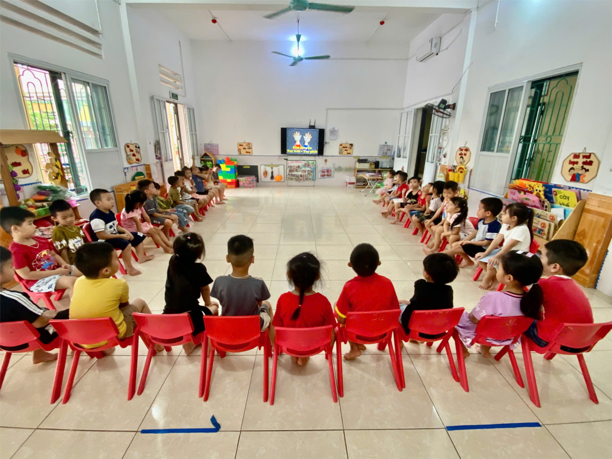 Trong quá trình nghe kể chuyện, các bé chăm chú quan sát, lắng nghe từng chi tiết của câu chuyện “Tay trái, tay phải”. Trẻ hào hứng giơ tay phát biểu, trả lời câu hỏi của cô và chia sẻ suy nghĩ của mình về nhân vật. Không khí lớp học trở nên sôi nổi, đầy ắp tiếng cười và sự tự tin của các em nhỏ.
