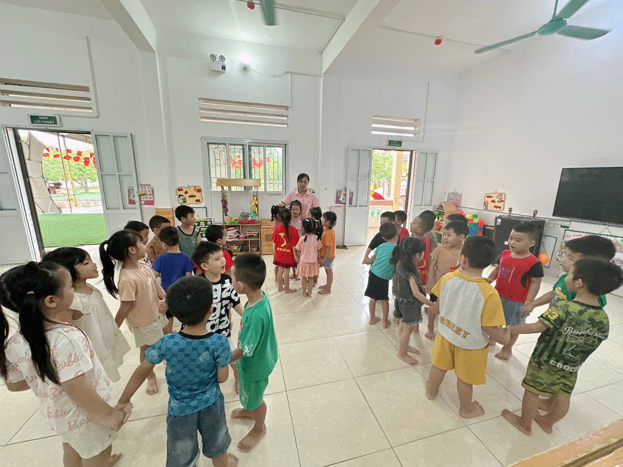 Trong quá trình chơi trò chơi “Kết bạn”, các bé hào hứng vận động theo hiệu lệnh, lắng nghe tín hiệu và nhanh chóng tìm bạn để tạo thành nhóm. Trẻ biết phối hợp nhịp nhàng, giao tiếp vui vẻ và hỗ trợ nhau trong khi chơi. Hoạt động không chỉ mang lại niềm vui mà còn giúp các bé rèn kỹ năng hợp tác và gắn bó với bạn bè và ôn lại kiến thức đã học.