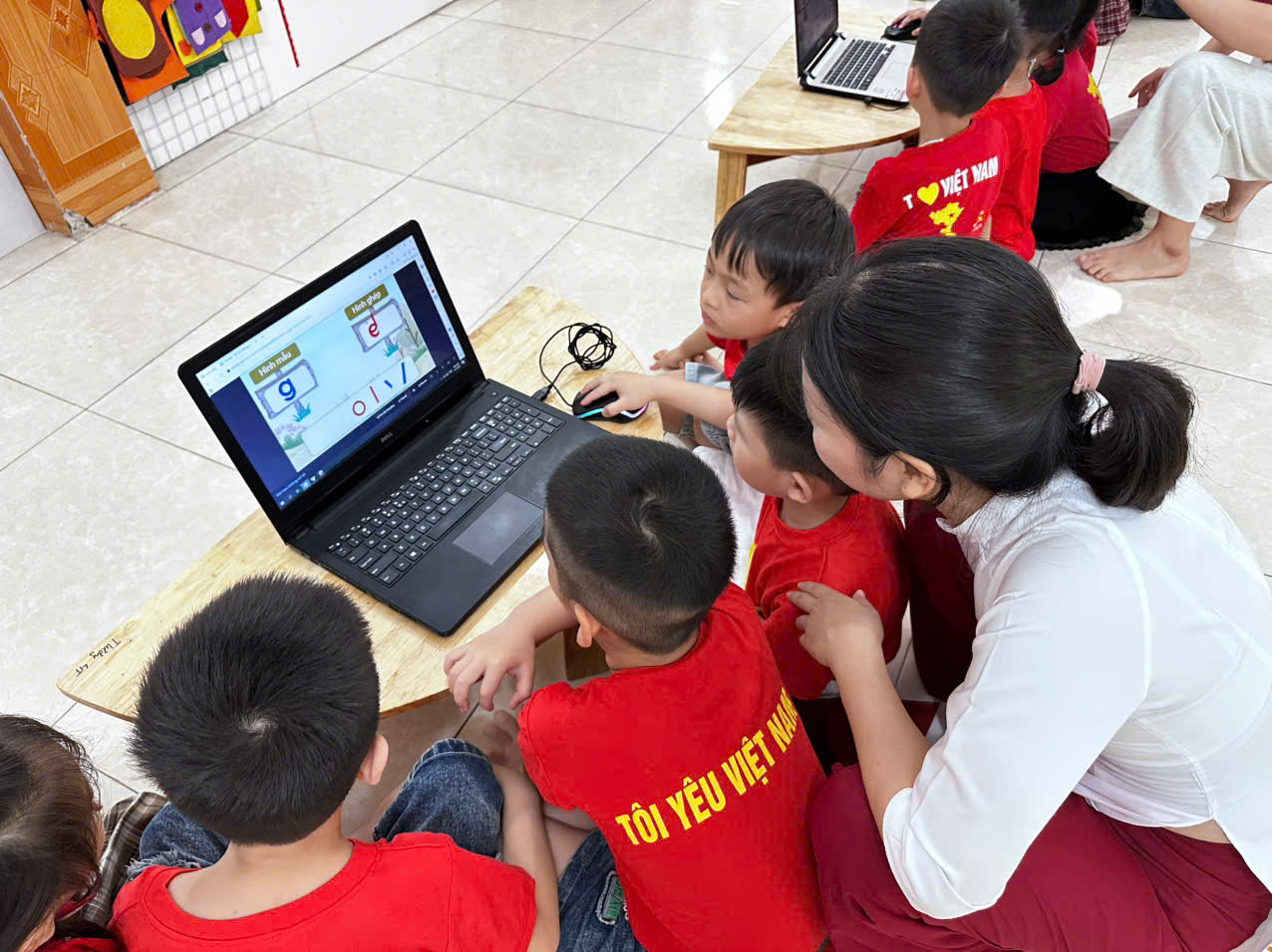 Trẻ tích cực tham gia các trò chơi chữ cái g – y được thiết kế trên máy tính và màn hình tương tác, tạo hứng thú học tập rõ rệt. Thông qua các phần mềm học tập sinh động, trẻ hào hứng lựa chọn, kéo thả và nhận diện đúng chữ cái g và y. Việc ứng dụng công nghệ thông tin giúp trẻ vừa học vừa chơi hiệu quả, phát triển khả năng tư duy và phản xạ nhanh.
