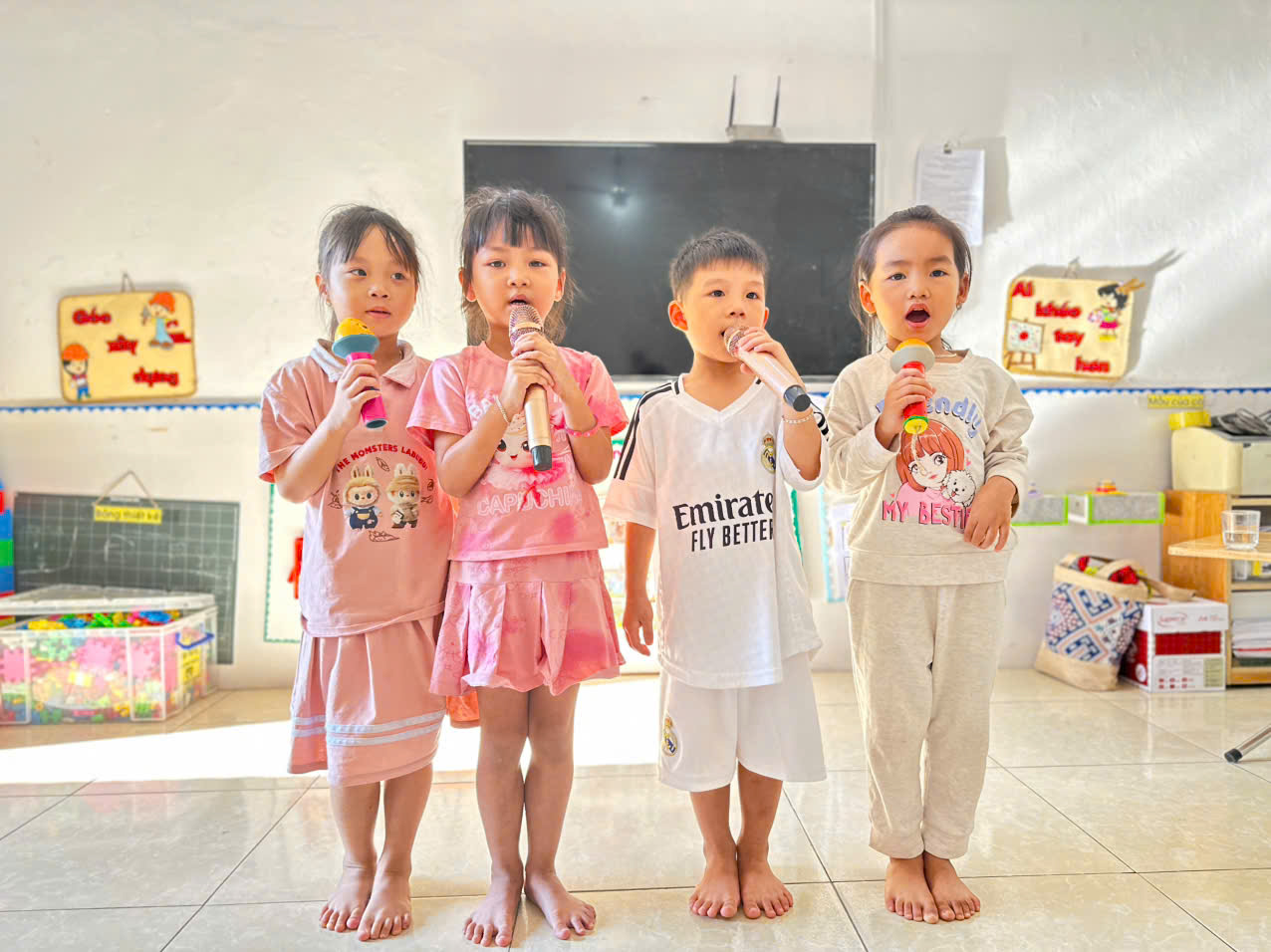 Các bé hào hứng cất cao giọng hát theo giai điệu vui tươi của bài “Chiếc bụng đói”, khuôn mặt rạng rỡ và đầy cảm xúc. Trẻ tự tin thể hiện từng câu hát, kết hợp vận động minh họa nhịp nhàng theo lời ca. Không khí lớp học trở nên sôi nổi, tràn đầy tiếng hát và tiếng cười của các em nhỏ.