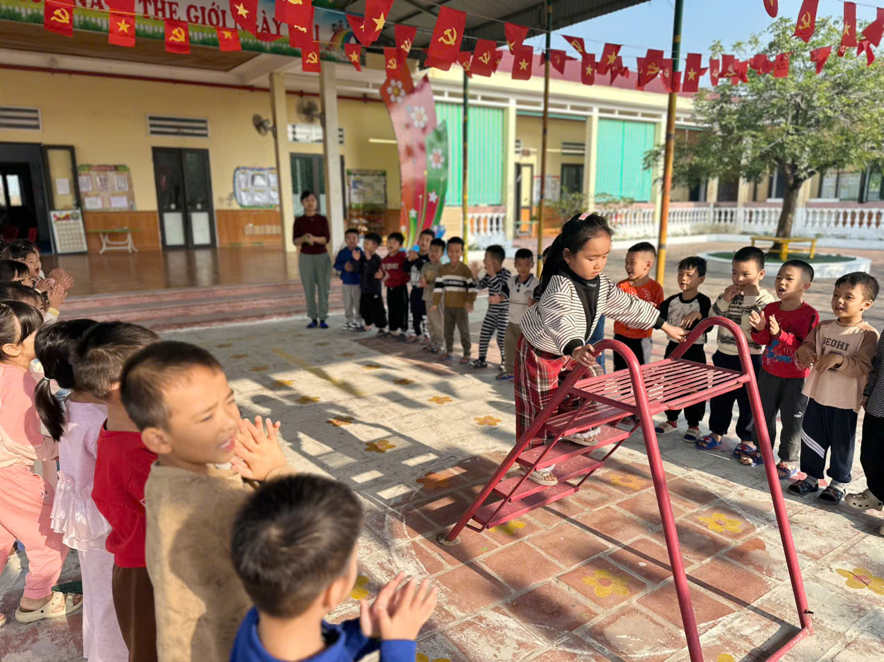 Khi trẻ thực hiện hoạt động trèo lên 7 gióng thang, trẻ biết phối hợp nhịp nhàng tay – chân, rèn sức mạnh cơ bắp và khả năng giữ thăng bằng. Trẻ trở nên tự tin, nhanh nhẹn hơn trong vận động và biết đảm bảo an toàn cho bản thân khi tham gia hoạt động thể chất.