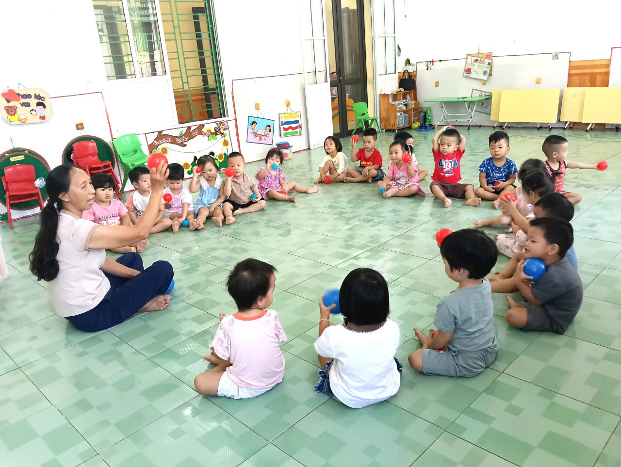 Trong hoạt động “Nhận biết, phân biệt quả bóng màu xanh – màu đỏ”, các bé lớp nhà trẻ 24-36 tháng của Trường Mầm non Thanh Lương rất hào hứng tham gia. Dưới sự hướng dẫn nhẹ nhàng của cô giáo, trẻ được quan sát, so sánh và gọi tên màu sắc của từng quả bóng. Qua hoạt động, các con rèn luyện khả năng quan sát, phát triển ngôn ngữ và nhận biết màu sắc cơ bản