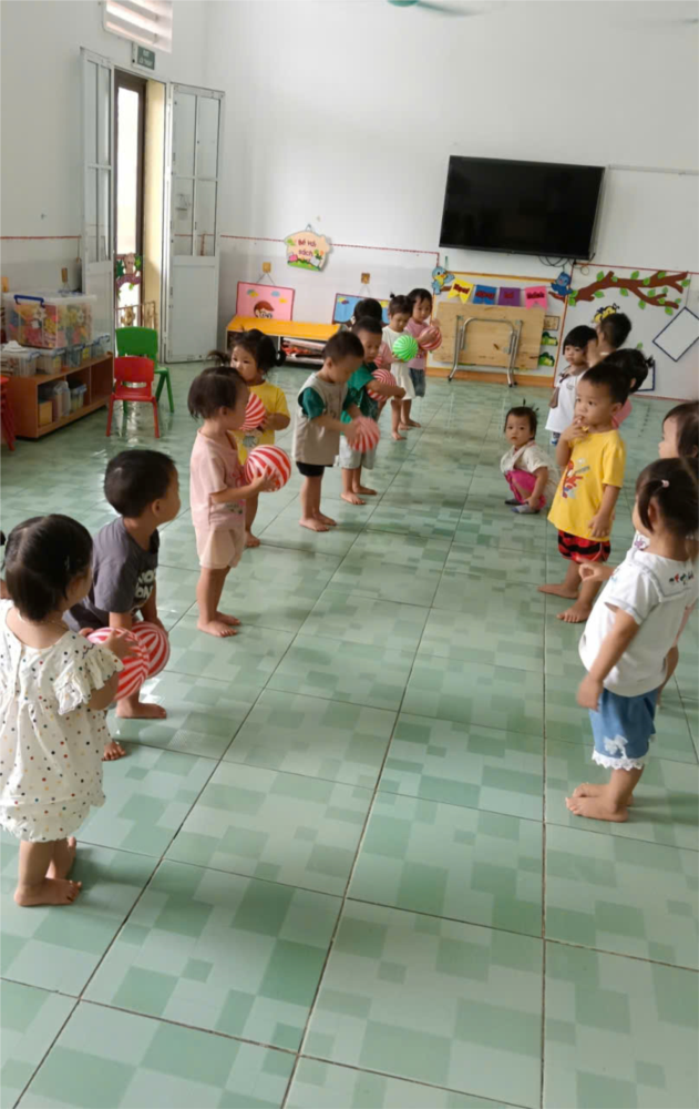 làm quen với VĐ tung bắt bóng. Ban đầu, trẻ quan sát cô làm mẫu và lắng nghe cách cầm, tung và đón bóng. Sau đó, các con được thực hành cùng cô, từng bước trải nghiệm niềm vui khi bóng bay và quay lại trong tay mình. Hoạt động diễn ra sôi nổi, mang đến cho trẻ niềm hứng thú, sự khéo léo và tinh thần mạnh dạn, tự tin hơn.