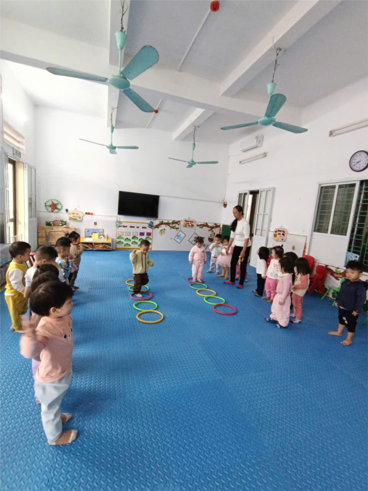 rong giờ vận động “Đi bước qua các ô vòng”, cô giáo tạo tình huống gần gũi để trẻ hứng thú tham gia. Trẻ được làm quen với các ô vòng, nghe cô hướng dẫn cách đi và lần lượt thực hành. Cô quan sát, hỗ trợ kịp thời, tôn trọng nhịp độ của từng trẻ. Qua hoạt động, trẻ được rèn kỹ năng vận động và cảm nhận niềm vui khi hoàn thành nhiệm vụ.