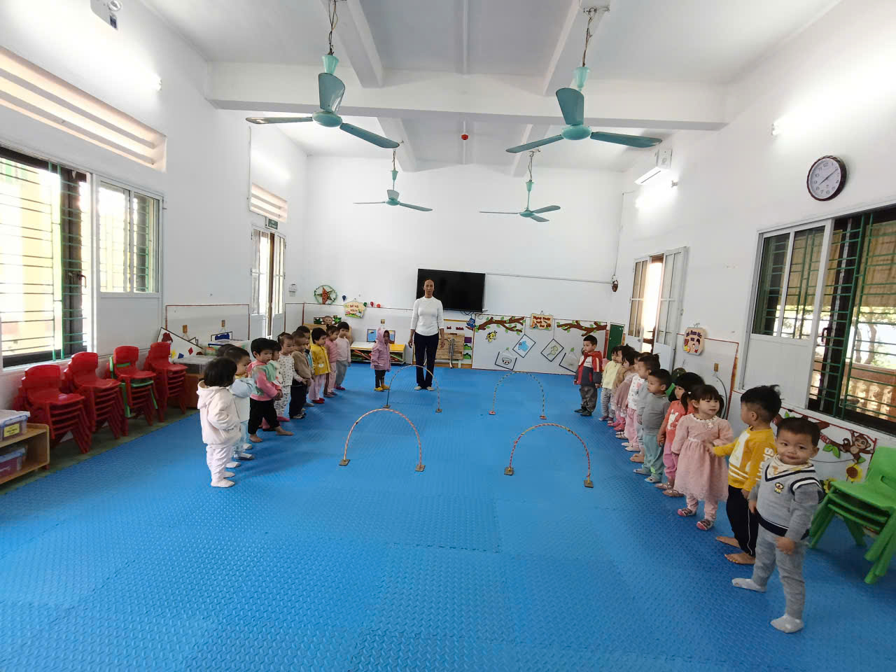 Trong hoạt động vận động “bò chui qua cổng”, cô tạo cơ hội cho trẻ quan sát cổng chui, lựa chọn cách chơi và mạnh dạn trải nghiệm theo khả năng của mình. Trẻ được hướng dẫn qua thao tác mẫu rõ ràng, sau đó lần lượt thực hành với sự động viên để phát huy tính chủ động và tự tin. Cô quan sát, hỗ trợ từng bé khi cần thiết, đồng thời khen ngợi những cố gắng nhỏ nhất của trẻ. Hoạt động giúp trẻ phát triển kỹ năng vận động thô, sự khéo léo và tinh thần mạnh dạn khám phá.