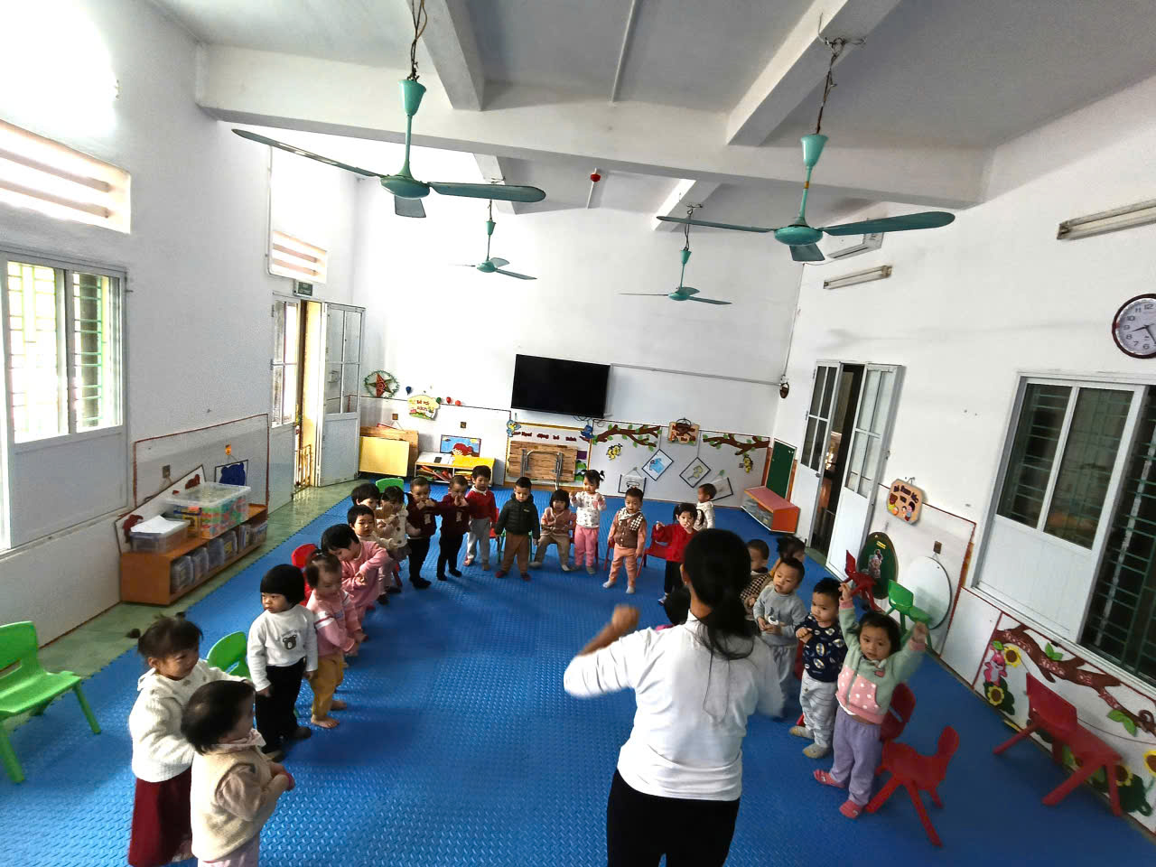 “Đu quay” được tổ chức theo hướng lấy trẻ làm trung tâm, tạo cơ hội để các bé quan sát, lựa chọn và thể hiện động tác theo khả năng riêng. Trong quá trình học, cô nhẹ nhàng lồng ghép giáo dục cảm xúc – xã hội, giúp trẻ nhận biết niềm vui, sự hào hứng khi cùng bạn bè vận động theo giai điệu. Trẻ được khích lệ bày tỏ cảm xúc, hợp tác với bạn và tự tin thể hiện trước tập thể. Qua đó, hoạt động không chỉ rèn kỹ năng vận động mà còn góp phần nuôi dưỡng cảm xúc tích cực và tinh thần gắn kết ở trẻ nhỏ.