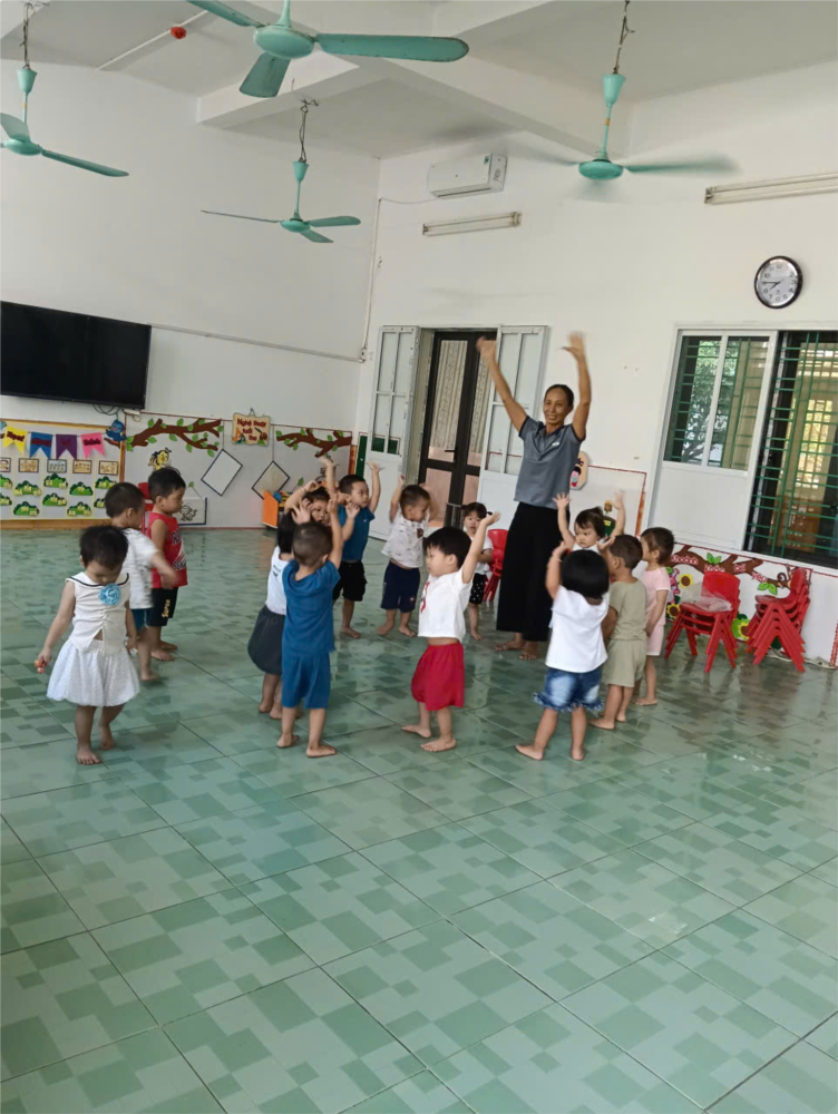 Trong giờ thể dục sáng, các bé hào hứng cùng cô tập bài “Ồ sao bé không lắc”. Trẻ vừa nghe nhạc vừa làm theo những động tác đơn giản như lắc lư tay, chân, nghiêng đầu, nhún nhảy. Các bé tập trung quan sát, bắt chước và dần phối hợp nhịp nhàng theo lời hát. Không khí vui tươi, rộn ràng giúp trẻ khởi động cơ thể khỏe mạnh và bắt đầu ngày mới đầy năng lượng.