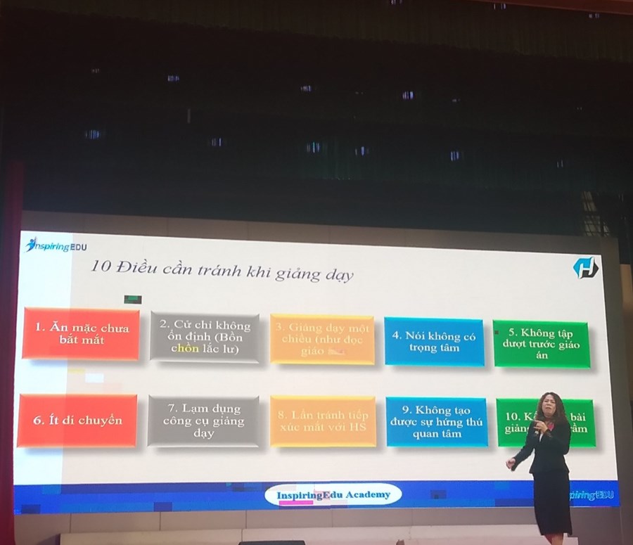 Trong hơn 2 giờ diễn thuyết, diễn giả đã tổ chức rất nhiều hoạt động như gập giấy, xé giấy, hỏi đố tương tác, hoạt động chân tay giúp giáo viên cởi bỏ gánh nặng tâm lý, có cái nhìn tích cực hơn về vai trò của người làm chủ trong lớp học.