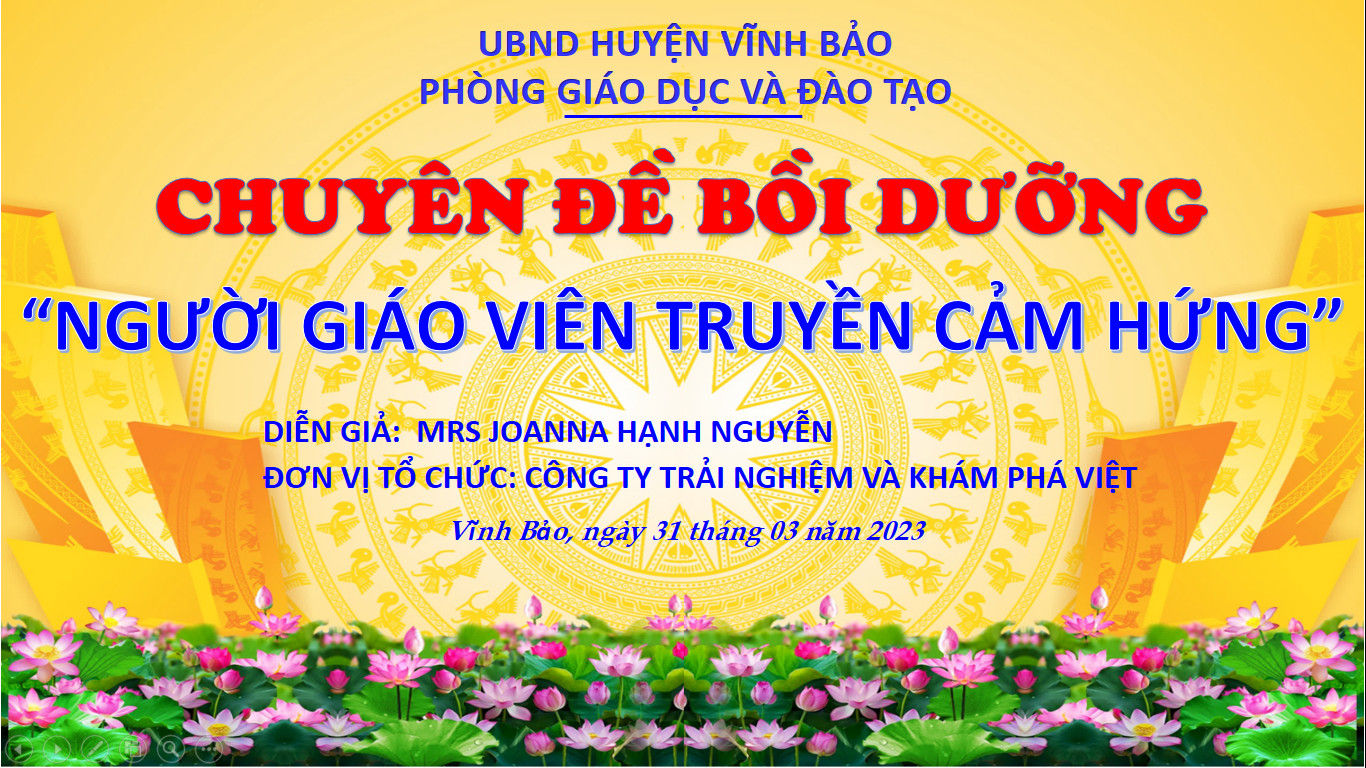 Ngày nay, chúng ta đang sống trong thời đại mà khoa học, kĩ thuật, công nghệ thông tin phát triển như vũ bão. Trong xã hội ấy, làm việc gì cũng cần phải có hiểu biết, có tri thức, vì vậy việc học là rất cần thiết và có vai trò ý nghĩa vô cùng quan trọng đối với mỗi người. Việc học là một quá trình tích luỹ kiến thức lâu dài, mà tri thức nhân loại lại vô bờ bến, thế nên mỗi học sinh cần có sự tập trung ý chí và xác định thật đúng đắn mục đích học tập của mình. Bên cạnh đó, cảm hứng học tập cũng là một điều có ý nghĩa to lớn trong quá trình tích lũy tri thức. Vì vậy, truyền cảm hứng học tập là một việc làm có ý nghĩa thiết thực trong giai đoạn giáo dục đang yêu cầu đổi mới như hiện nay. Chiều ngày 01/04/2023, 100% giáo viên Trường mầm non Thanh Lương tham dự chuyên đề "Người giáo viên truyền cảm hứng” do Phòng Giáo dục và Đào tạo tổ chức với sự tham gia của Diễn giả - tác giả - nhà truyền động lực MRS Joanna Hạnh Nguyễn.