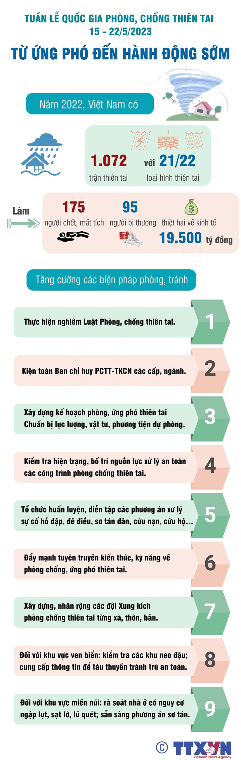 Tuần lễ Quốc gia Phòng, chống thiên tai năm 2023 (từ ngày 15-22/5) có chủ đề “Từ ứng phó đến hành động sớm,” với mục tiêu tăng cường thông tin truyền thông; nâng cao năng lực cộng đồng, nâng cao tinh thần, trách nhiệm của các cấp, các ngành từ Trung ương đến địa phương trong công tác phòng chống thiên tai; sẵn sàng các phương án ứng phó với thiên tai năm 2023.